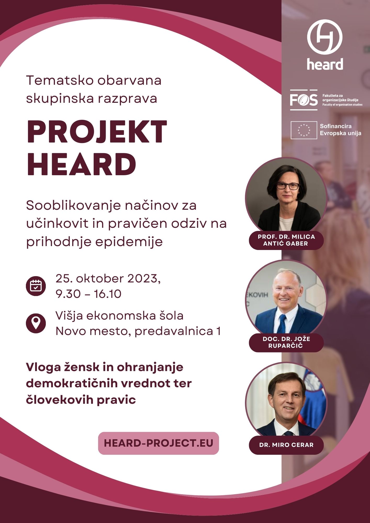 Fakulteta za organizacijske študije v Novem mestu bo 25. oktobra 2023 v okviru projekta HEARD izvedla tematsko obarvano skupinsko razpravo, z naslovom »Sooblikovanje načinov za učinkovit in pravičen odziv na prihodnje epidemije: vloga žensk in ohranjanje demokratičnih vrednot ter človekovih pravic«, ki bo gostila strokovnjake in predstavnike iz partnerskih držav.