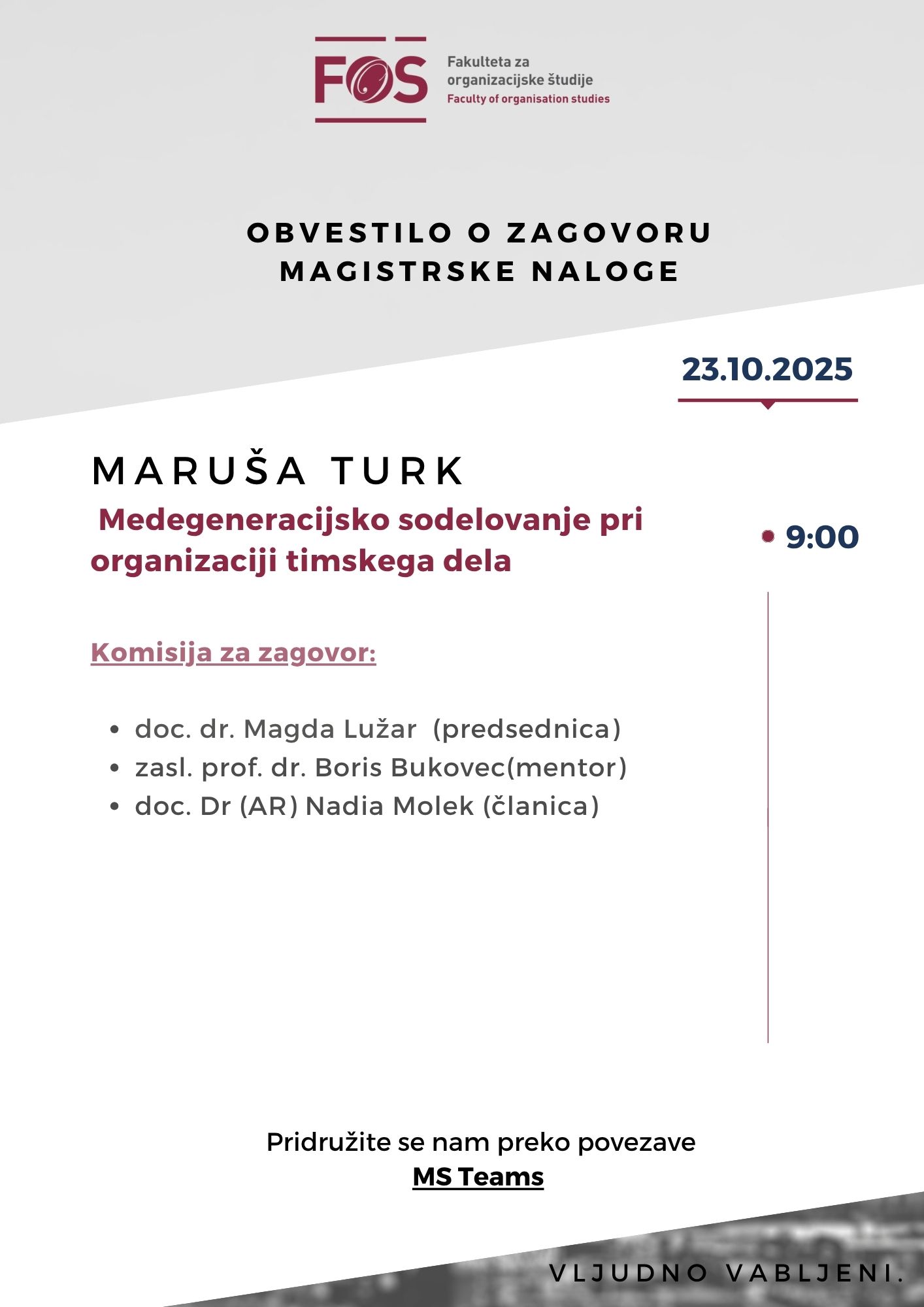 Obvestilo o zagovoru magistrske naloge: Maruša Turk