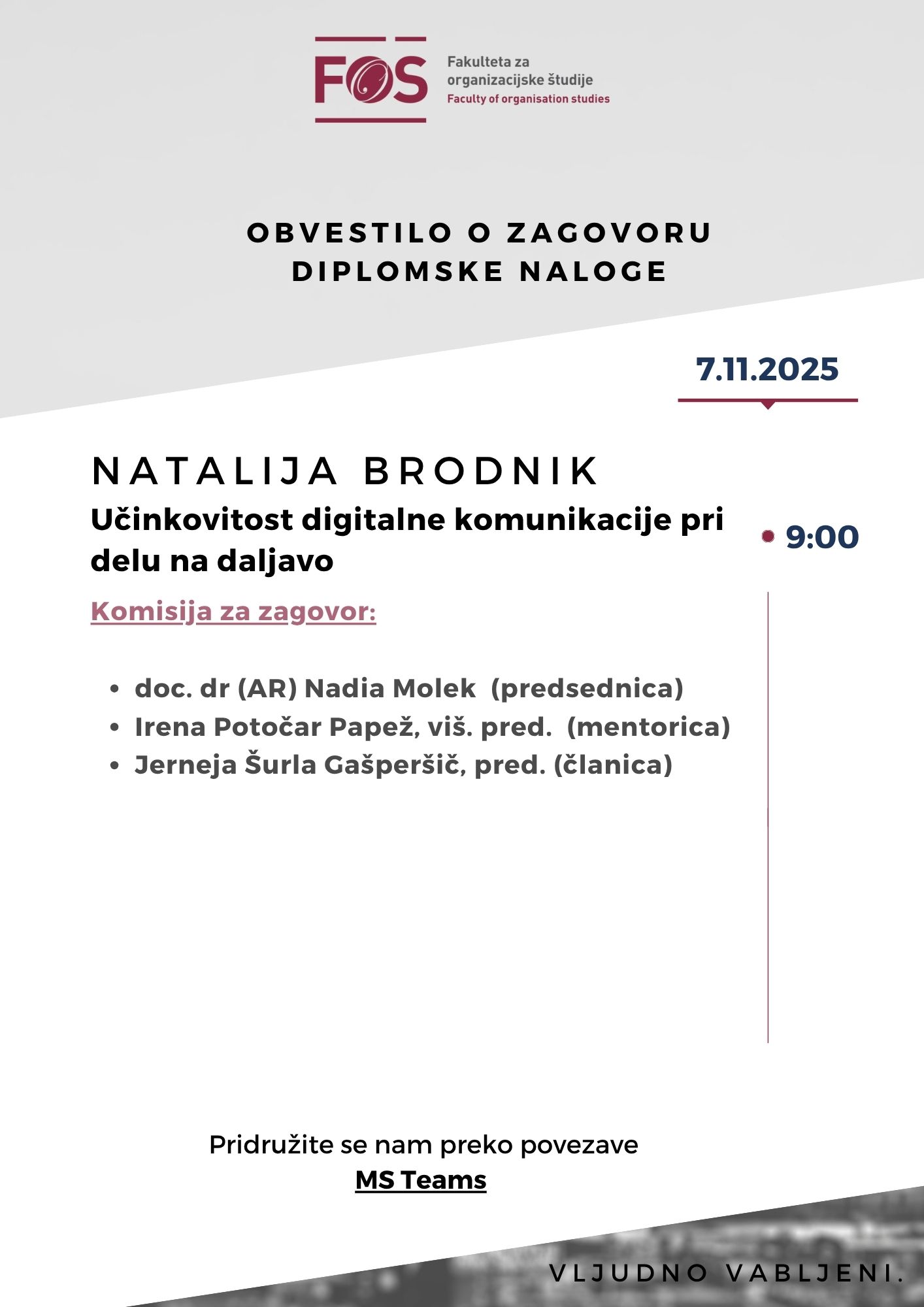 Obvestilo o zagovoru diplomske naloge: Natalija Brodnik